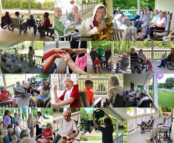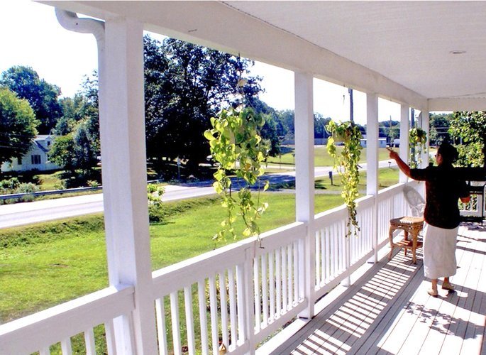 The setting includes a wrap-around porch and a residential-style house on a quiet property, providing light, airy spaces and accessibility for residents needing mobility support.