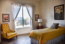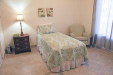 The facility emphasizes safety and comfort; it features tile flooring (no carpet), secure common areas, a roomy community living room, a lounge with TV, and a secure yard outdoors. Rooms include basic furnishings such as a dresser and a recliner.